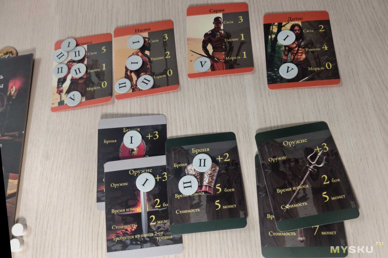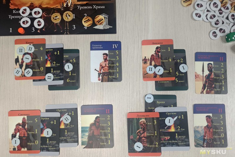 После следует единственный обязательный этап – оплата содержания. За каждого имеющегося бойца необходимо вернуть в общий запас по одному зерну. Затем можно улучшить силу или умение любого бойца (на +1 за каждую арену), а также заняться ковкой снаряжения.