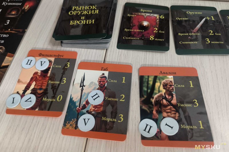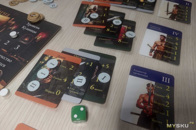 Карты гладиаторов необходимо разделить по типам (игроков, провинций четырех уровней, Рима и чемпионов Рима), перемешать и сложить стопками вдоль поля рубашкой вверх. Карты оружия и брони следует собрать в одну колоду и открыть пять верхних – это рынок. Рядом кладется стопка с двухсторонними картами для ковки – можно выбирать любые, главное, чтобы мощностей кузницы хватило.