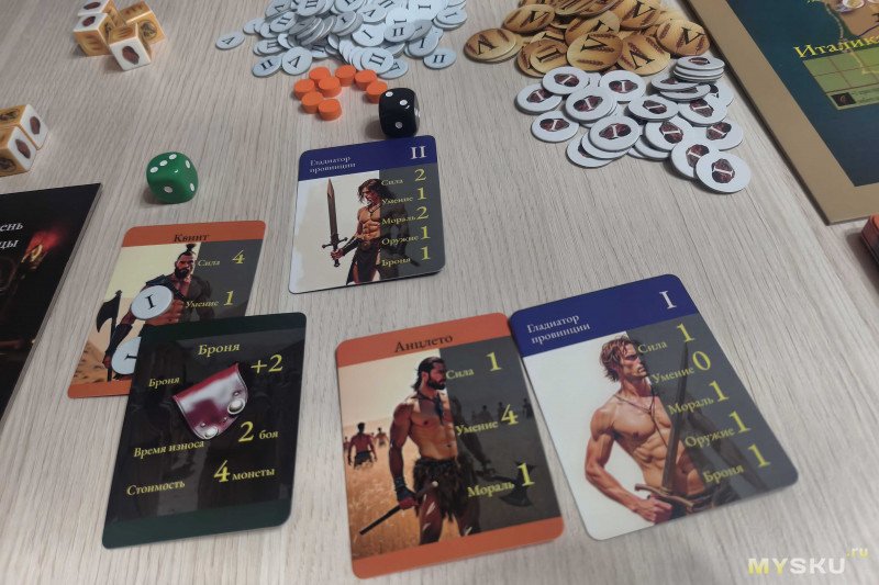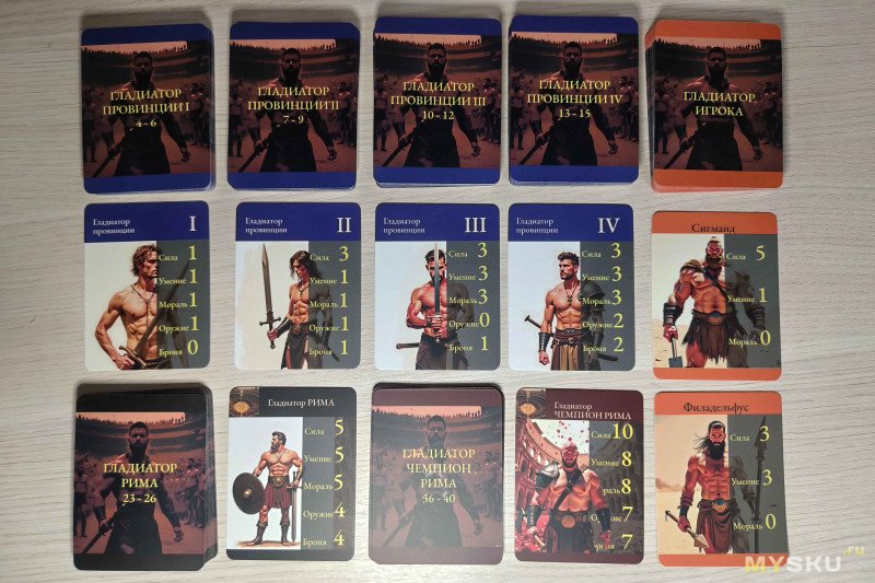 Каждому бойцу необходимо взакрытую выбрать соперника из стопок гладиаторов провинции. Последние разделены на четыре уровня, каждому из которых соответствует определенный диапазон силы бойцов (сумма всех характеристик). У противников значения оружия и брони уже вписаны в карточку.