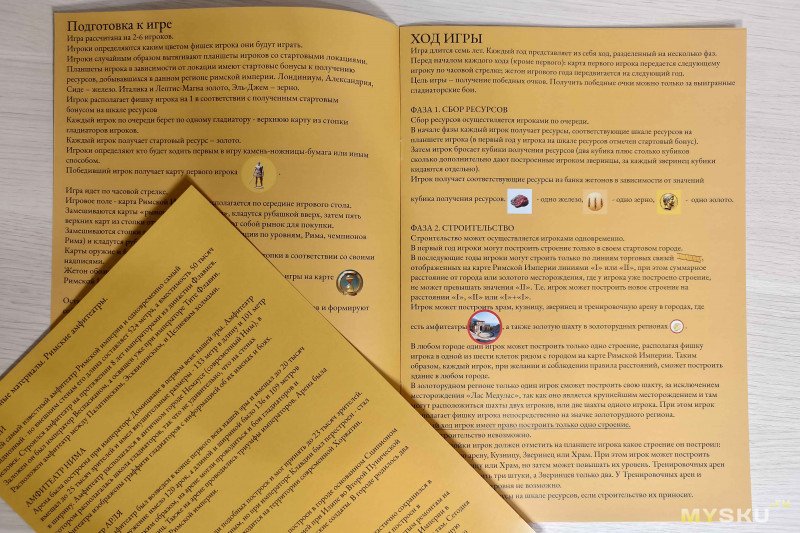Правила просты и логичны, осваиваются за полчаса, однако, в комплекте идет устаревший неполный вариант. Игра продолжает развиваться, и руководство регулярно дополняется – последнюю версию можно скачать в TG-канале. Оно красивое, подробное и наглядное, а также содержит механику событий, без которой играть скучно. Кстати, в планах у «Котэвасии» выпустить дополнение, где будет финальный вариант правил, карточки событий и фигурки гладиаторов вместо жетонов хода и первого игрока.