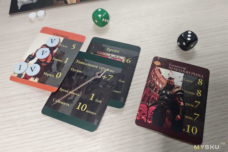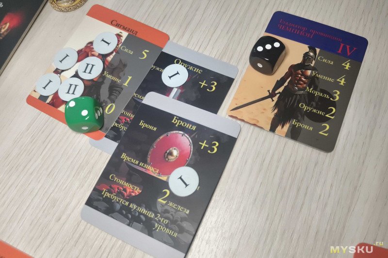 Первым делом бросаются кубики морали – зеленый дает соответствующий бонус бойцу игрока, черный – противнику. Затем производится сравнение бойцов по силе, умению и морали (с учетом кубика и храма), а также оружие сопоставляется с броней. Если разница в какой-либо характеристики равна или более двух, то боец получает дополнительное очко. При этом преимущество брони над оружием прибавки не дает. Осталось только просуммировать все характеристики и бонусы у одного и другого бойца, чтобы выявить победителя.