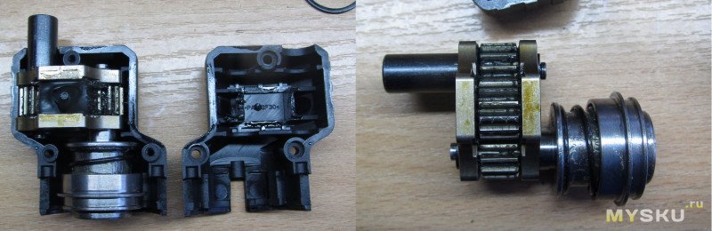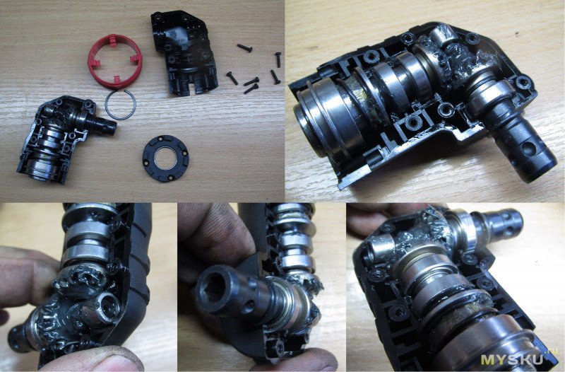 Разберем. Для этого нужно открутить пластину с выступами на «входе», и снять стопорное кольцо, далее снимаем красный фиксатор, ну и раскручиваем корпус — там винты на крестик. Разобрать я настоятельно рекомендую, потому что смазку хоть и положили, но по шестерням ее не размазали, а надо бы. Внутри всё хорошо и красиво, в угловом переходнике все валы на подшипниках, в переходнике со смещенным центром — на втулках.