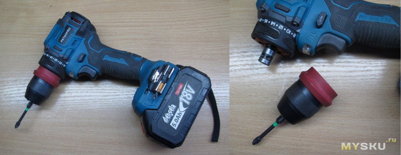 «Макитовская» батарея, съемный одномуфтовый патрон (правда в последнее время иногда проскальзывает при затягивании), ну а под патроном — битодержатель на 1/4" с магнитом, в который можно установить короткую биту, а сверху надеть патрон. Ну не песня ли?