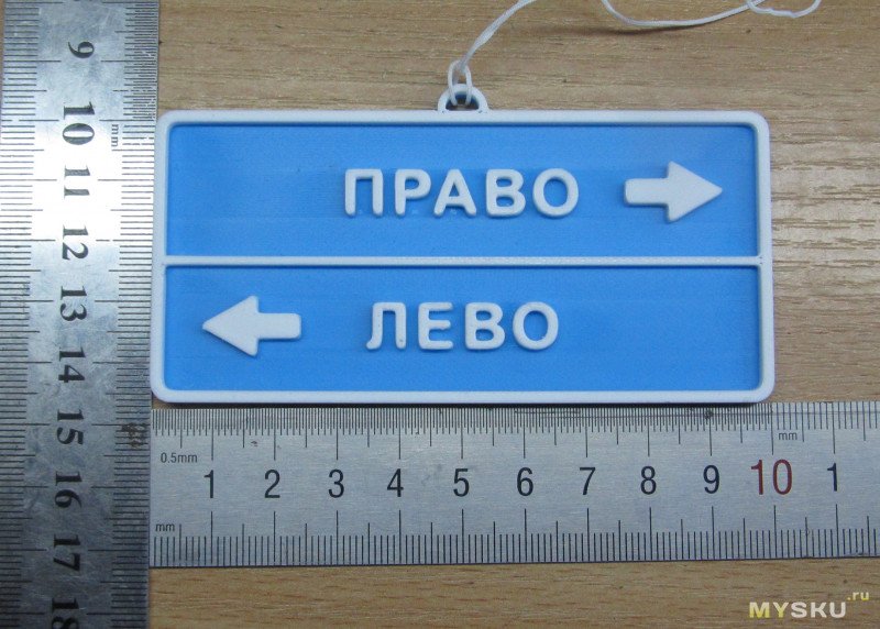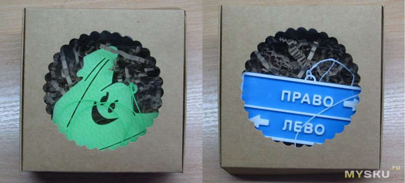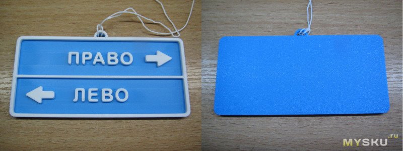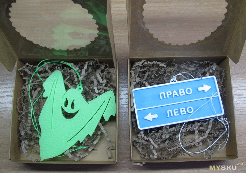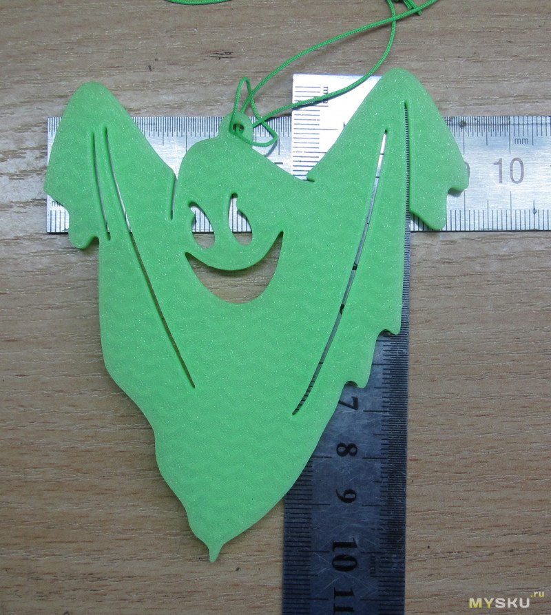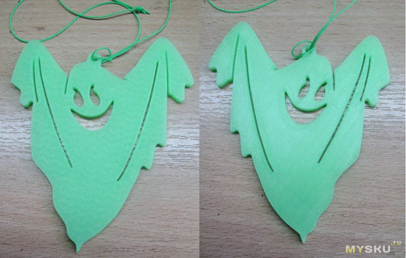 Цвета очень приятные для глаза (а в реальности еще приятнее, если честно), качество печати — отличное, табличка «право-лево» вообще для неискушенного человека не покажется печатной, у привидения одна сторона — матовая от подложки стола, а на второй конечно видны следы печати, но в глаза они особо не бросаются. Очень порадовало отношение к деталям (надеюсь это не случайность) — у привидения шнурочек зелененький, в цвет. Также у привидения проглядывается зигзагообразное заполнение — и это явно тоже сделано специально. Короче, производитель прям заморочился и упаковкой и собственно подвесками. Тот случай когда сам бы сделал может и дешевле, но за такой результат без лишней головной боли не жалко отдать денег. И принтер покупать не нужно. А головная боль тут будет — для привидения нужно будет найти и купить светящийся пластик — а он денег стоит, а для второй таблички заморочиться с заменой цвета в процессе печати, да и сам голубой пластик такого приятного оттенка тоже еще надо будет поискать. Плюс упаковка…