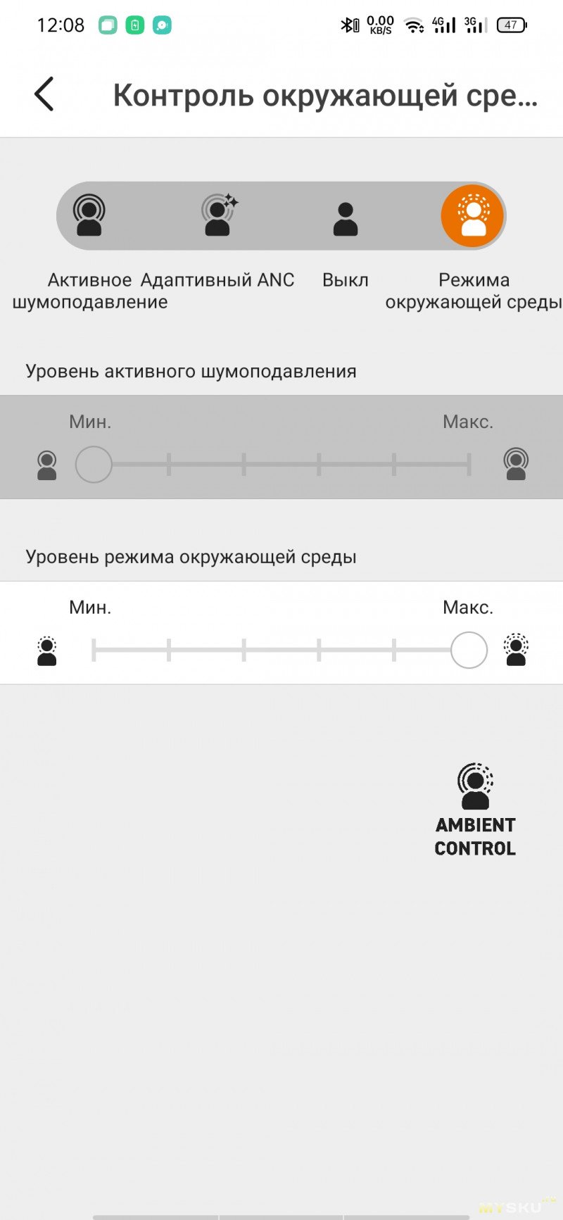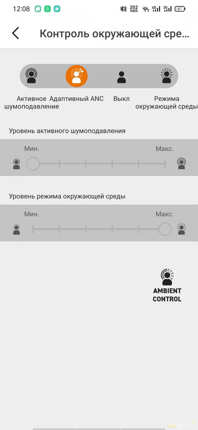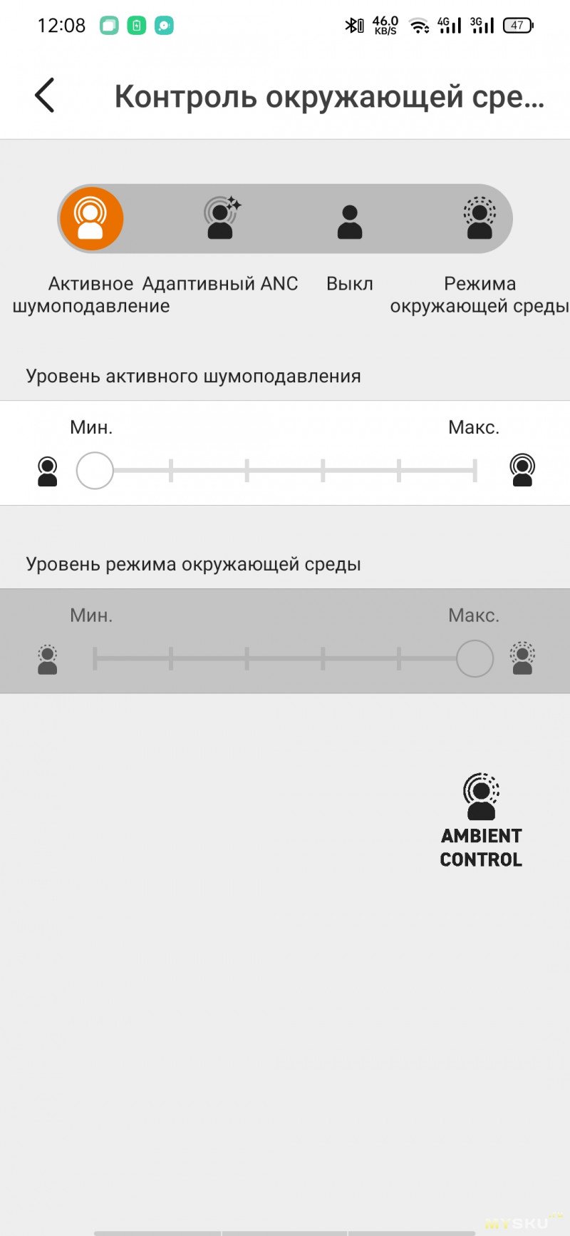 В последней вкладке сосредоточены все настройки, связанные с гибридным шумоподавлением и режимом прозрачности. Режимы можно настроить под себя, отрегулировав уровни на шкалах. Однако, в режиме адаптивного ANC регулировка уровня недоступна. При желании всё это можно просто выключить.