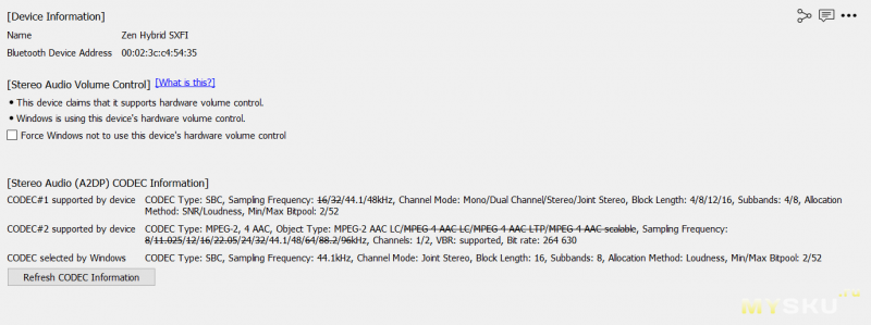 В наличии AAC и SBC кодеки, что и подтверждает сканирование специализированной утилитой, но Windows 10 по умолчанию выбирает кодек SBC.