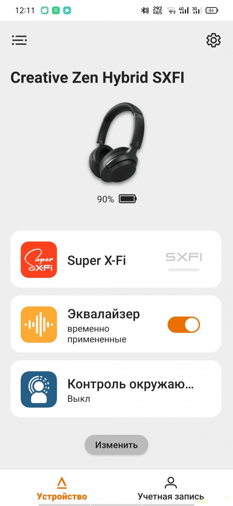 После подключения становятся доступны два кодека AAC/SBC и возможность отследить уровень оставшегося заряда у наушников. Для доступа к полноценному функционалу потребуется скачать и установить фирменное приложение Creative. На главном экране видны три основные вкладки — Super X-FI, Эквалайзер и Контроль окружающей среды.![]() | ![]() | ![]() |