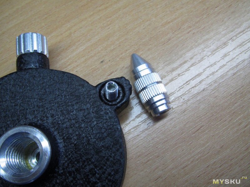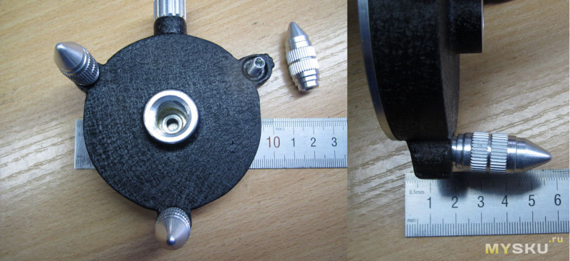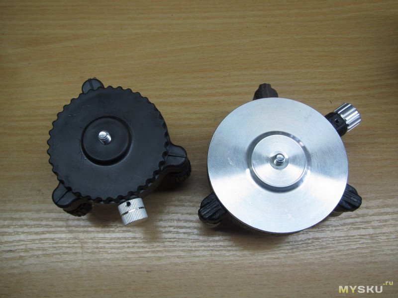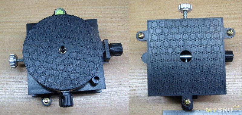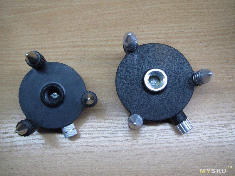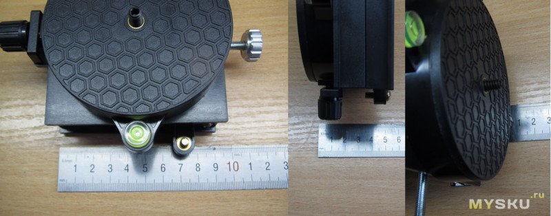 Вместо ножек как в родном и купленном поворотных адаптерах тут просто винты, которые я закрутил неправильно чтобы не мешались. винт на 1/4" тут в виде короткой шпильки (ну или установочного винта без шляпки). Ну и присутствует пузырьковый уровень — мелочь, а приятно, особенно за эти деньги.