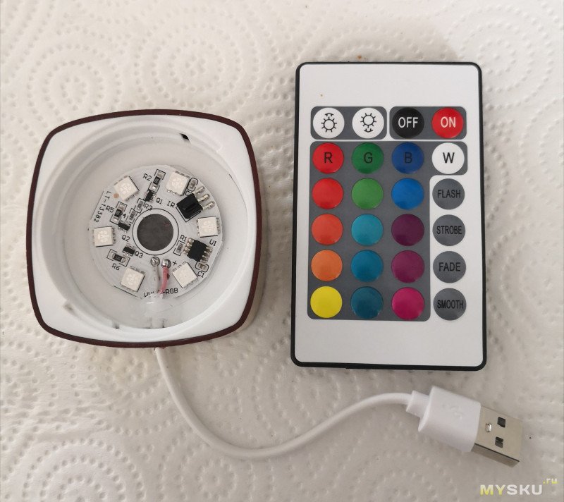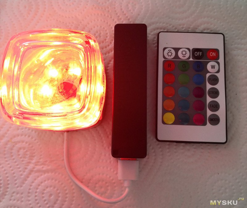 Попробовал днём включить — очень слабо светит, что ж, ночью вернулся к светильнику: