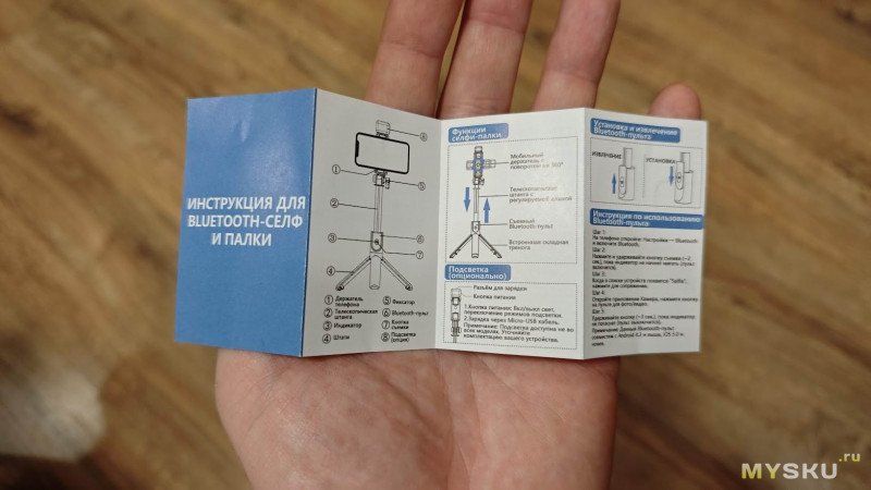 Внутри коробки находится селфи-палка безо всякой упаковки, а также крохотная, но глянцевая и цветная инструкция.