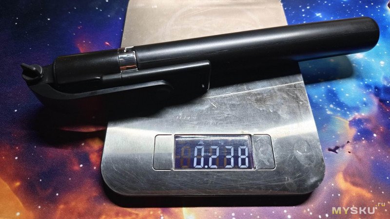 В сложенном состоянии обозреваемый гаджет имеет длину 30 см при диаметре 3 см, а весит целых 238 грамм.
