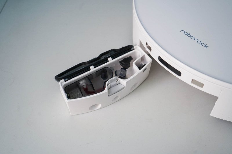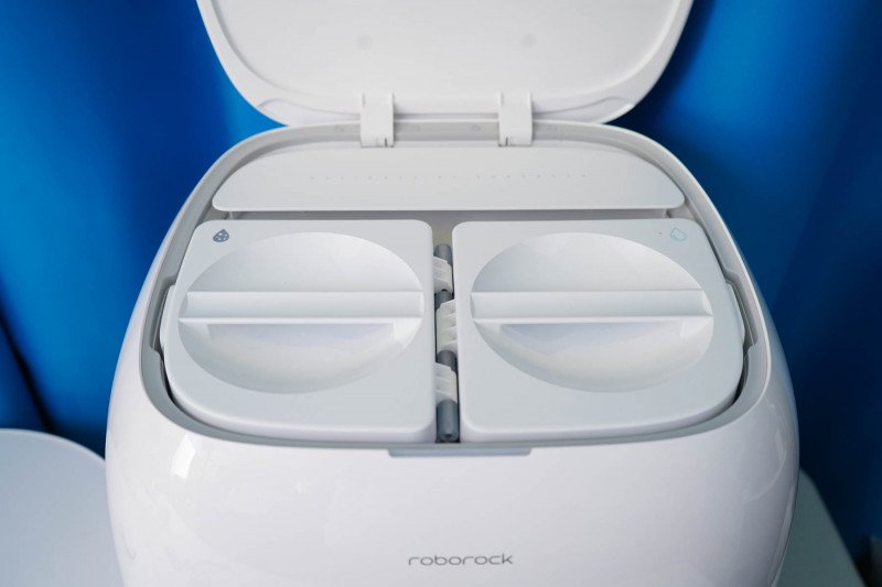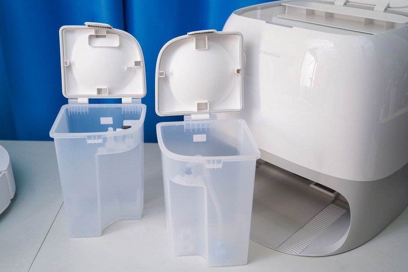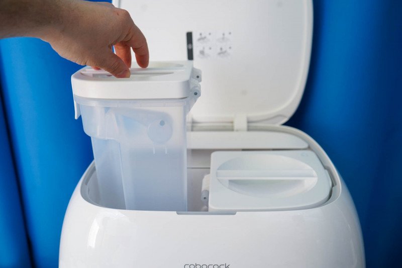 Что касается хранения различных жидкостей, их сбора и сбора мусора, то все это происходит на станции. Внутри располагается контейнер для чистой воды и контейнер для отходов — все это под верхней крышкой.