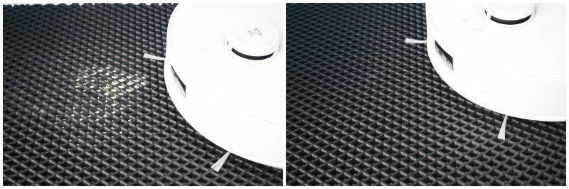 Такой робот нужен, фактически, для регулярной комплексной (сухой+влажной) уборки без моего ежедневного участия. Прихожу — полы чистые, семечки не набросаны, следов от лап нет. Ну если только свежего не набедокурили без меня. Разводов при уборке не остается, разве что специально установить максимальный уровень смачивания (как на фото — тогда видны следы от ролика). С умеренным смачиванием ролика такая уборка вполне подходит для ламината/паркета.