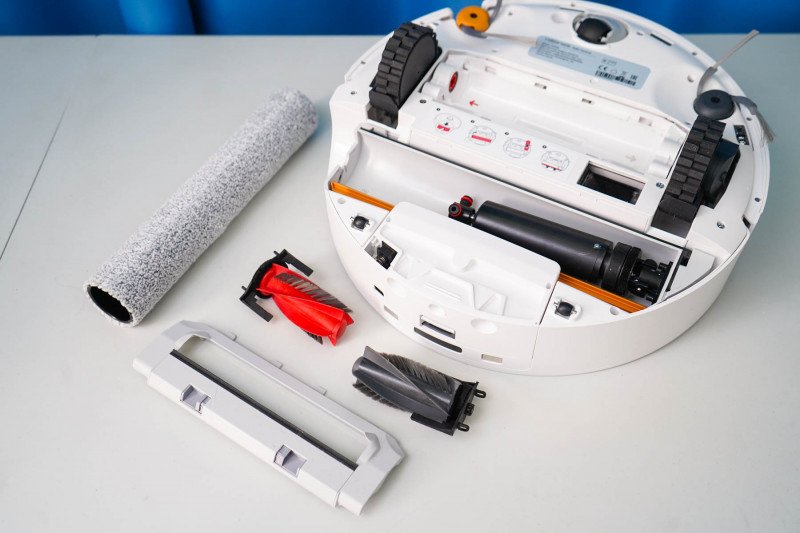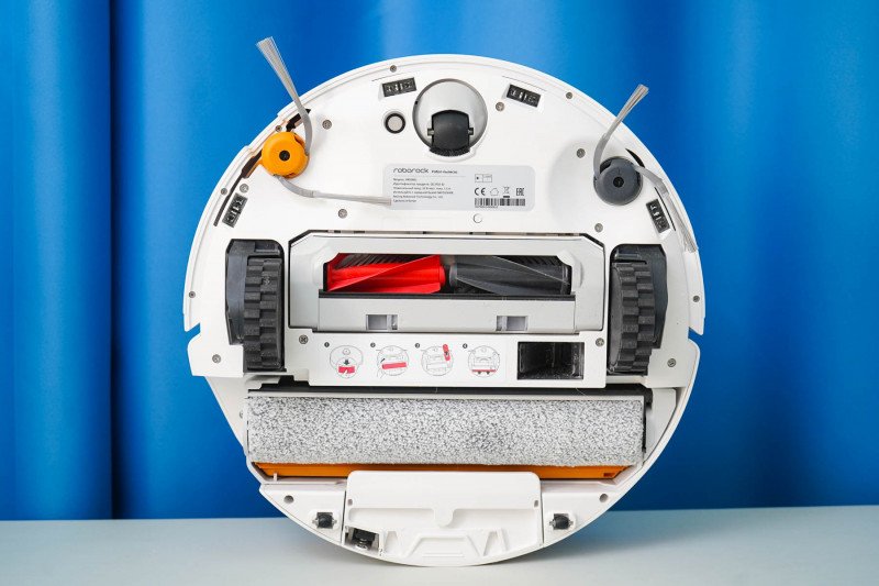 На нижней (рабочей) части робота размещаются две боковые щетки, сдвоенная центральная щетка, ролик с системой отжима. Есть защита от запутывания, оптические датчики (падения и т.п.), УЗ датчик ковра. Отмечу, что мусор удаляется через нижнее отверстие в роботе.
