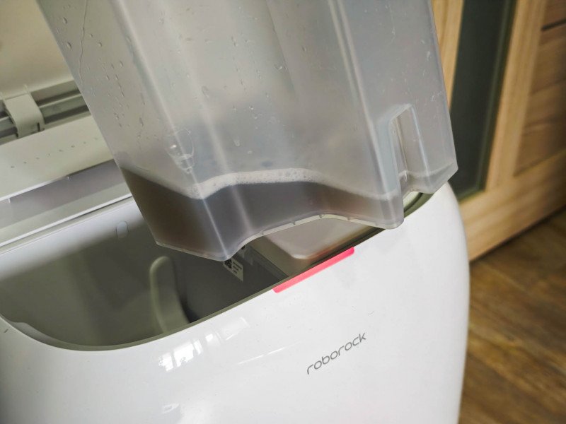 Грязная вода после уборки и после самоочистки собирается во вместительном контейнере. Затем активируется автоматическая сушка ролика. Я стараюсь надолго не оставлять грязную воду в контейнере — несложно её слить, а контейнер сполоснуть. Кстати, обратите внимание на цветовую индикацию на верхней кромке корпуса робота — отображает состояние и готовность к работе.