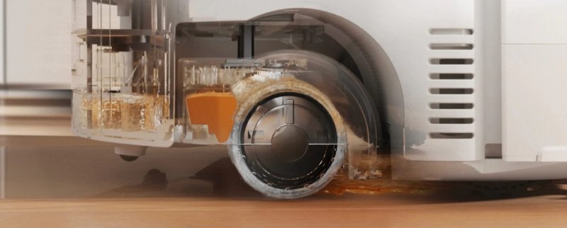 Когда то давно у меня был простой робот с подобной уборкой, один из первых, с определенными недостатками. Так вот, в этой модели серьезно доработали подобный тип уборки. Ролик SpiraFlow — это — протирочный ролик с непрерывной самоочисткой в режиме реального времени, которая помогает избежать повторного загрязнения пола роликом и решить проблему традиционной влажной уборки обычных роботов «чем больше моешь — тем грязнее». Этот ролик прижимается (давление сила 15Н) к поверхности пола, протирает поверхность пола со скоростью вращения 220 оборотов в минуту. Есть функция подъема, выдвигания для боковой уборки, а также защиты ковров. Установленный позади ролика скребок собирает грязную воду в бак. Ширина ролика 27 см.