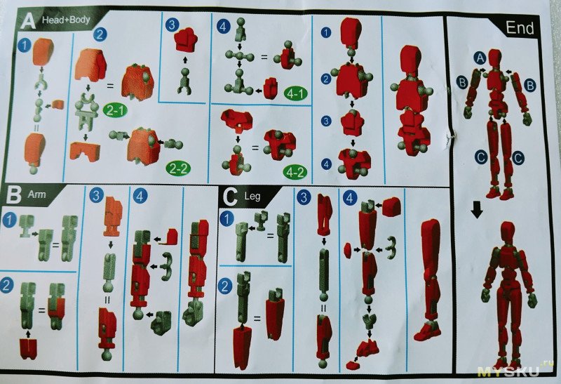Инструкция — корявая кошмар… Я по ней вначале пытался, потом забил. Обратите внимание на вывернутые локти например (с коленями вроде нет проблем, но локти куда пошли, даже на картинке с жёлтым — они по другому):