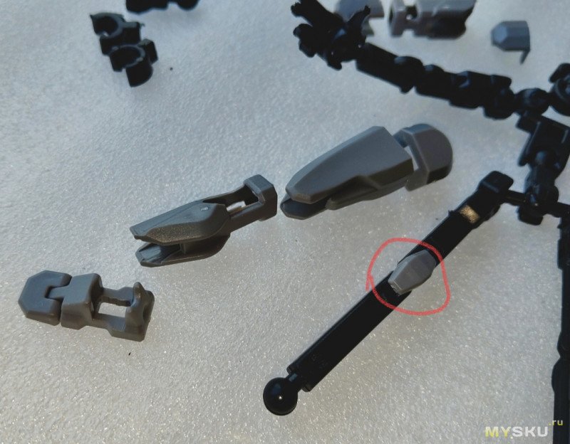 Не стал каждую деталюшку фоткать, считаю одной достаточно — вот то место, куда «втыкаться» шарик сочленения должен — это место у всех деталей кривое. Шарик тот еле держится, точнее слишком свободно (в итоге ноги разъезжаются и тд):