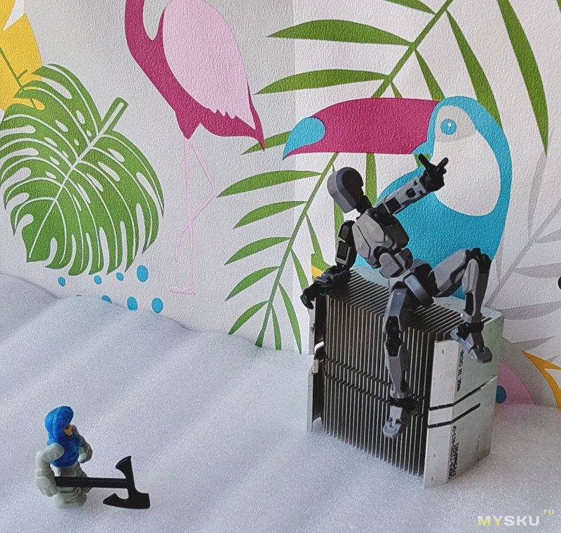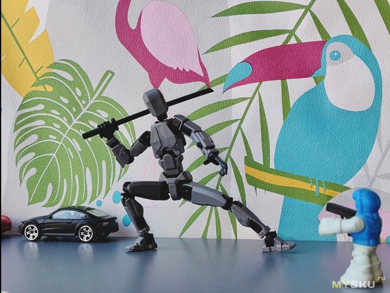 По итогам — забавная игрушка, со своими недоработками правда. Стоит ли покупки — без понятия, цена не критичная для безделушки. Посадил на край книжной полки, пусть будет. Делать какие-то диорамы или сценки — особо времени нет, да и шарниры очень не понравились — буквально с трудом добился устойчивости на фото выше.