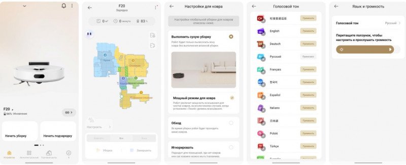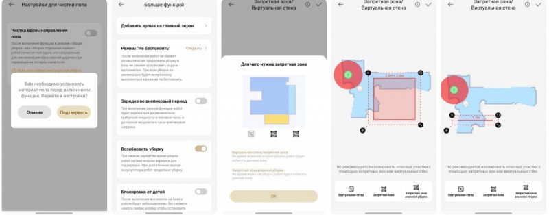 Реализовано зонирование помещение — можно разбить карту на отдельные комнаты и запускать уборку отдельно в каждой. Соответственно, можно установить виртуальный барьер, где нужно, или выделить место локальной уборки. Умеет объезжать ковры — и показывает их на карте.