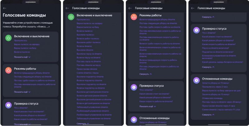С помощью голосовых колонок (пробовал для Алисы) можно отправить робота на уборку иди вернуть на базу. Есть проверка статуса, а также, что интересно, команды с отложенным запуском.