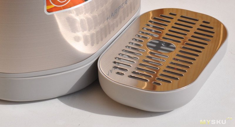 Серая часть корпуса HARPER HTP-5T02 — матовый пластик, светло-золотистая — это тонкая алюминиевая облицовка. Цвет спокойный, впишется в любой интерьер. Форма в сечении квадрат со скругленными углами. Есть индикатор уровня — с разметкой 1/2/5 литров (он еще подсвечивается при работе).
