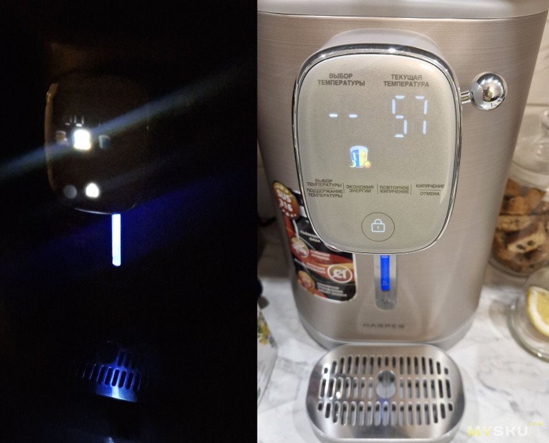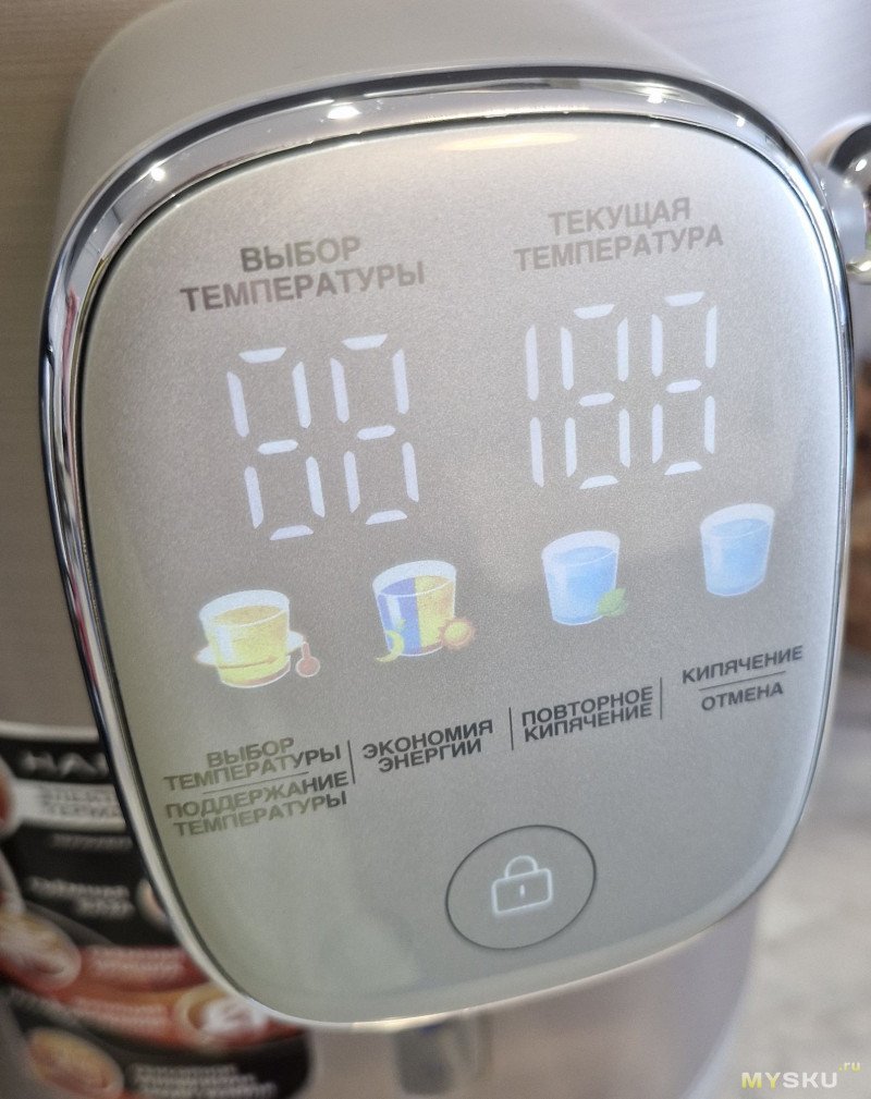 Высота цифр почти 2 см — видно издалека. Плюс есть звуковые сигналы.Режимы работы интуитивно понятные: кипячение (как в обычном чайнике), повторное кипячение + 2-5 минут для дехлорирования воды, выбор температуры подогрева воды и поддержание заданной температуры, эко режим не греет воду, когда в комнате темно и блокировка подачи воды (от детей). Активация клапана помпы механическая — блестящим рычажком.