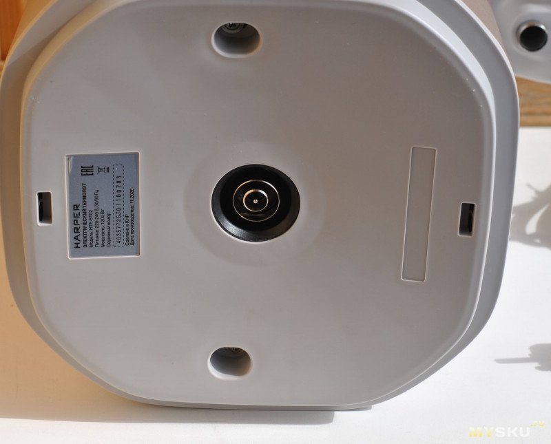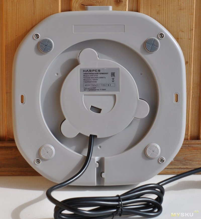 Помимо термопота HTP-5T02, руководство пользователя и гарантийного талона видим, что-то узнаваемое от электрочайников — подставка с контактной группой, что-то от кофемашинок — поддон под капли.Подставка не скользит на столе, и туда можно спрятать излишек сетевого шнура: