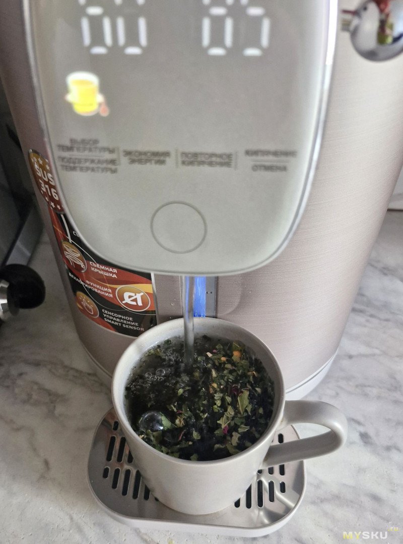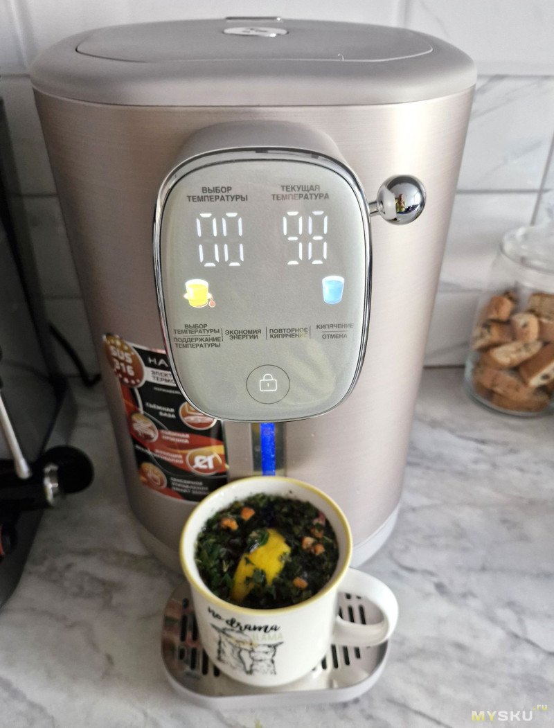 Термопот HARPER HTP-5T02 на 5 литров можно назвать «станцией горячей воды» для для больших семей, офисов и ситуаций, когда нужно быстро приготовить напиток определённой температуры. Справляется там, где маловато обычного чайника (плюсом точный контроль температуры, большой объём и продуманная эргономика). И есть дехлорирование, если наливать не из бутылок. Отмечу тихую работу в режиме кипячения, удобную панель управления с крупными цифрами и приятные бонусы: рукоятку для переноски, индикатор объема и подставка.Из особенностей конструкции — могли бы запенить пространство между колбой и внешней стенкой, лучше бы сохранял тепло и был бы тише, но видимо не технологично для ремонта потом. Ну и при активном использовании расход электроэнергии выше, чем у обычного чайника, но сопоставим, если кипятить чайник 5–10 раз в день.