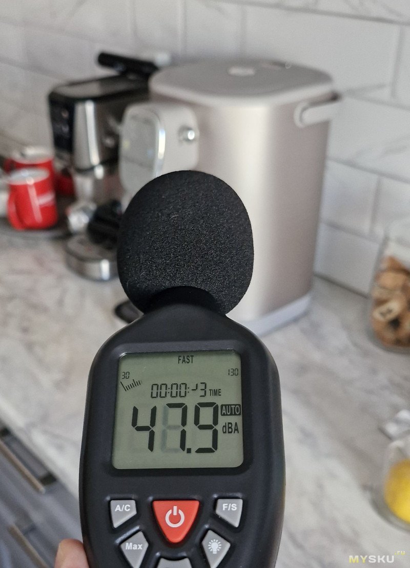 С пары метров уже почти не слышно, двойная стенка все-таки.Корпус снаружи не горячий, хотя внутри колбы кипяток: