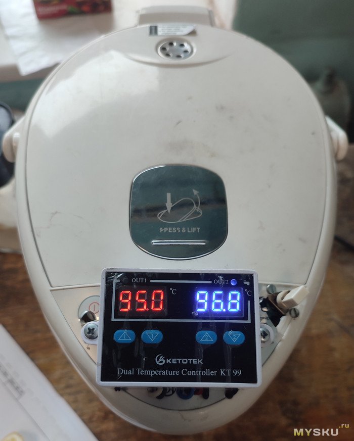 После закипания, можно выставить нужную температуру, которая будет поддерживаться внутри. По умолчанию 60 градусов, как только вода остынет до этой температуры — включится нагрев.