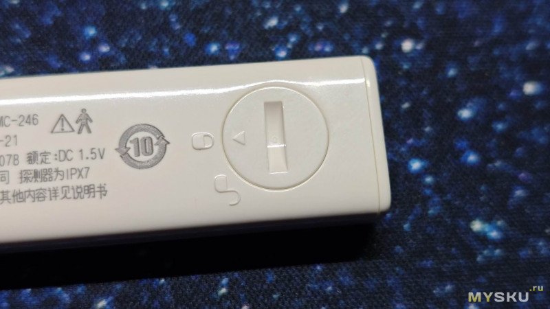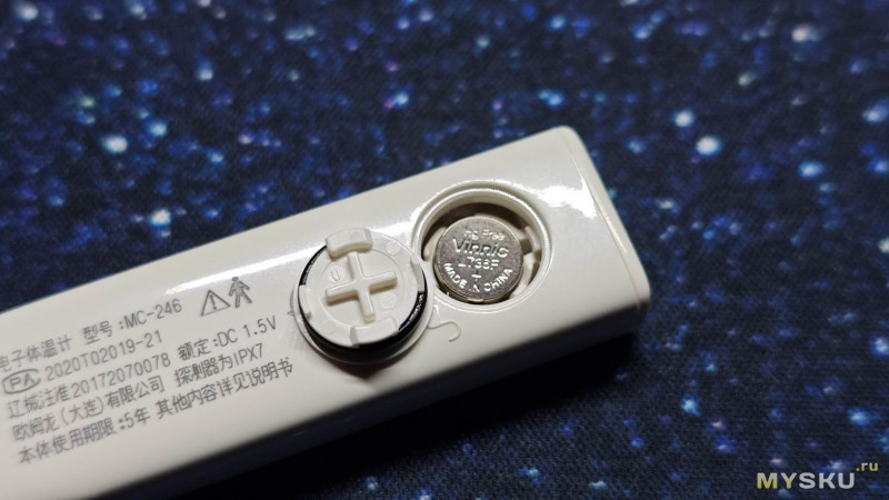 Внутри стоит круглый элемент питания типа LR736. Крышечка имеет уплотнительное силиконовое колечко, которое обеспечивает полную герметичность корпуса.