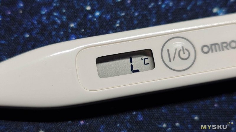 После её нажатия раздаётся короткий негромкий писк, а на дисплее загораются все возможные сегменты, затем появляется фиксированное значение 37°C, потом символ L. Появление этого символа говорит о том, что термометр готов к работе.