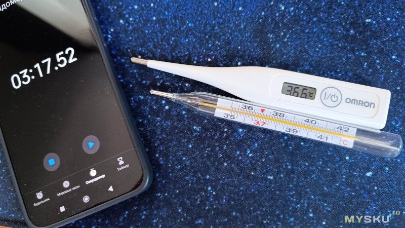 Повторяем опыт с включённым секундомером. До звукового сигнала прошло целых 3 минуты 17 секунд. Однако результат измерения у обоих термометров оказался тем, который и должен быть — 36,6 °C.