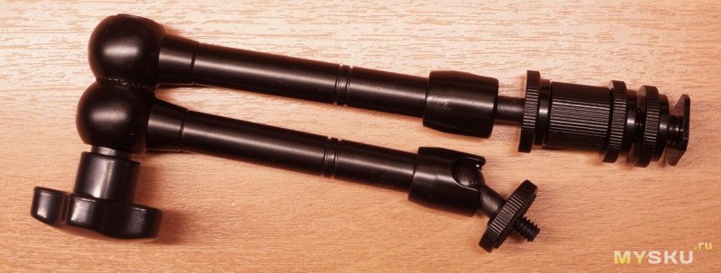 Размеры плеч руки от центра сочленения до центров шаровых зажимов — 10.5 см, болтовая часть шаровых зажимов добавляет еще 2 см, высокая переходная гайка с опорой для горячего башмака добавит ещё пару сантиметров и с небольшой натяжкой получаются те самые 11'' дюймов.