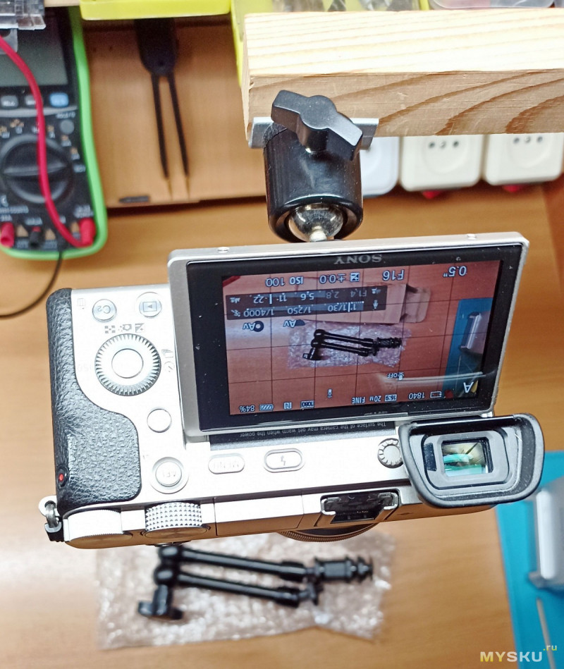Часто при описании каких либо самоделок, замеров в обзорах, удобно именно «сверху» делать фото предметов, расположенных на поверхности рабочего стола. Для этого нередко использую относительно компактный и не тяжелый фотоаппарат, в моем случае он удобнее телефона, да и фото иногда получаются лучше.
