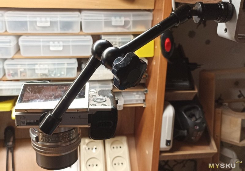 Для его закрепления над столом сделал примитивную консоль из рейки с закрепленным на конце поворотным шаровым зажимом. В целом удобно, но степеней свободы мне часто не хватает. Приходится приспосабливаться и выкручиваться — например, можно подставить что-то, чтобы приблизить мелкий предмет. Но каждый раз что-то подбирать уже немного надоело и уже начал подумывать про добавление регулировки по высоте и даже заказал второй шаровый зажим для расширения вариантов регулировки положения фотоаппарата в пространстве.