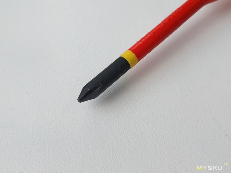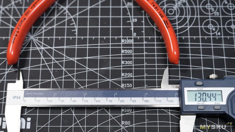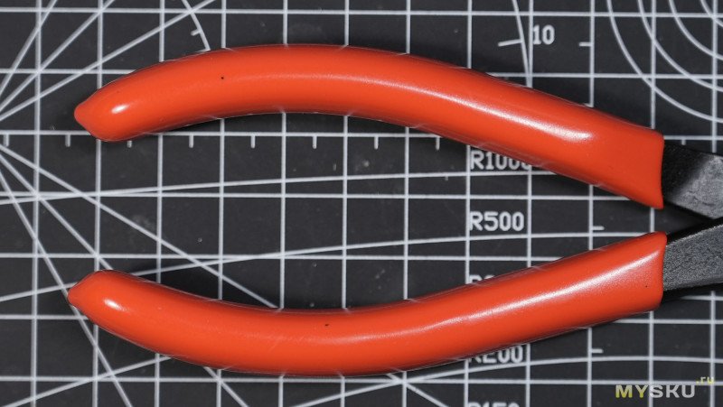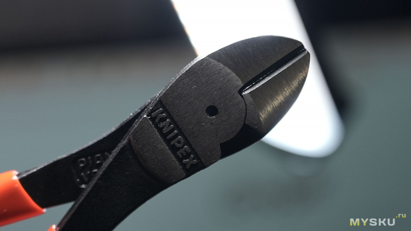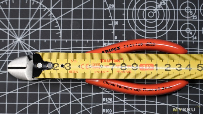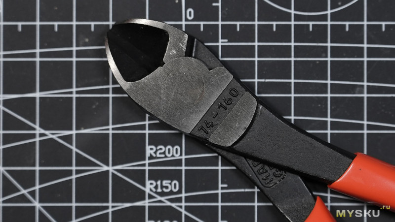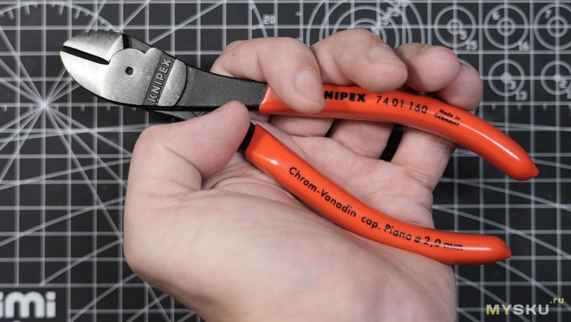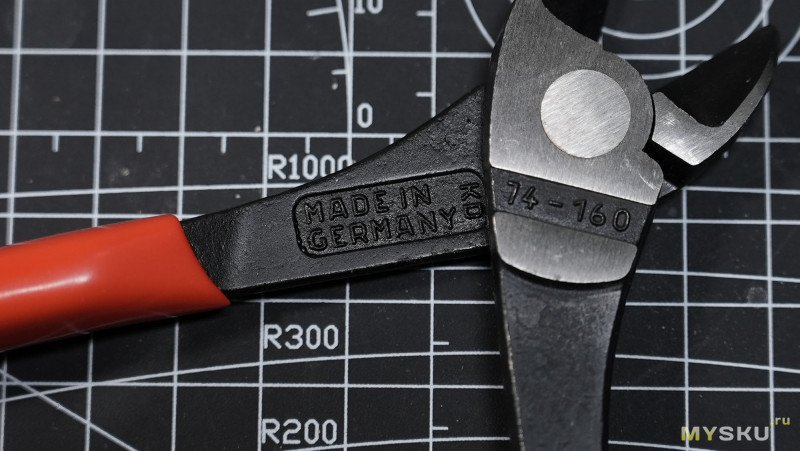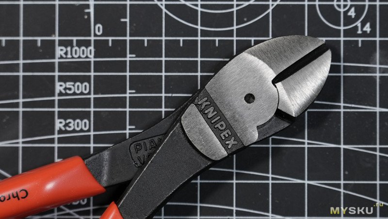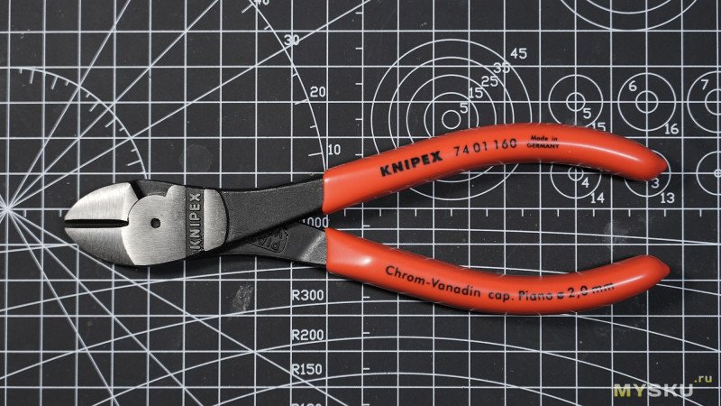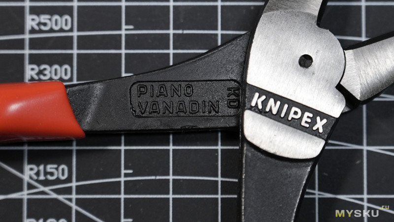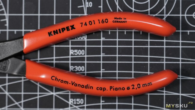 Обливка на ручках самая простая, красного цвета. С одной стороны чёрной краской напечатаны название бренда Knipex, модель 7401160, страна производства Germany, название стали Chrom-Vanadium, и предел для перекусывания (рояльная струна до 2мм).