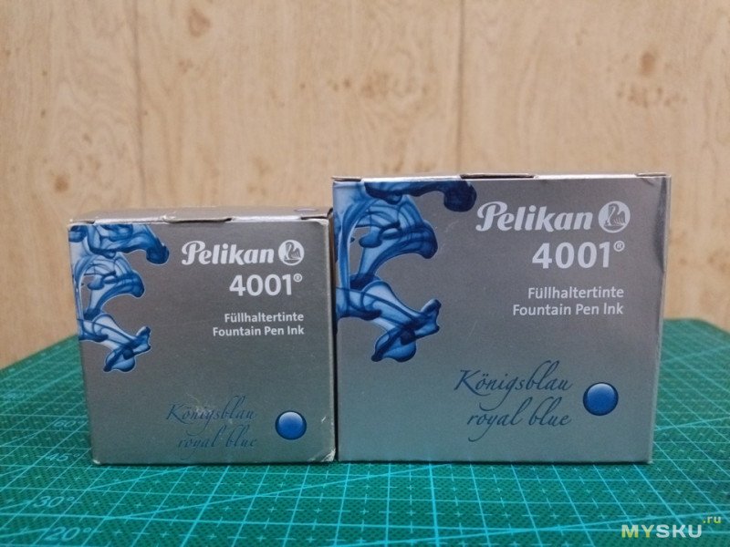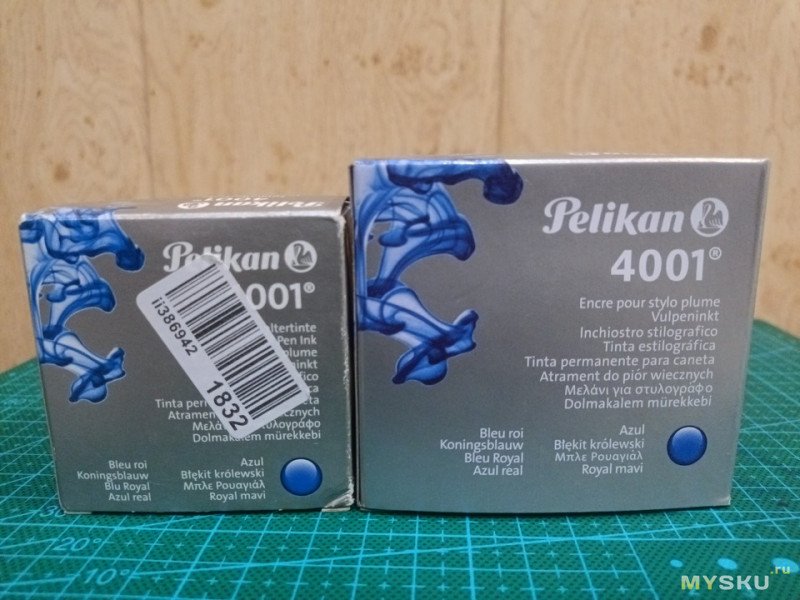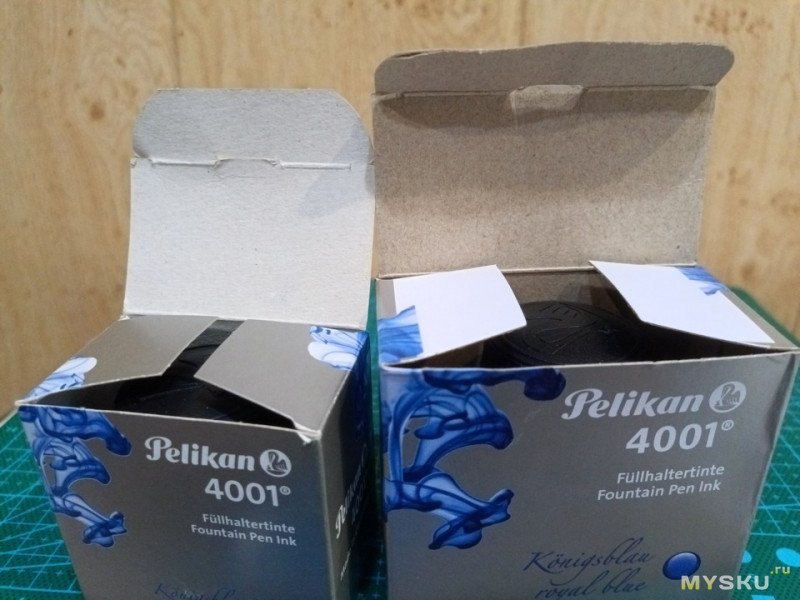 А серая коробка у «Пеликана» года так с 13-14. Кто уже помнит темно-синюю или белую с синими гранями коробку? Слева маленькая коробка. Картон у нее глянцевый, у новой матовый. На первый взгляд полиграфия почти такая же.
