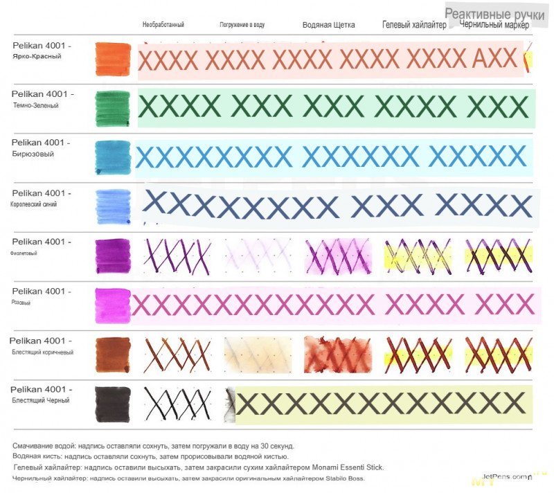Всё началось с иллюстрации одного магазина, а именно Jetpens, в которой пояснялась неустойчивость пеликановского набора цветов в линейке 4001 к воде в виде капель, мокрой кисти и паре типов выделителей текста, распространенных в данной части суши.