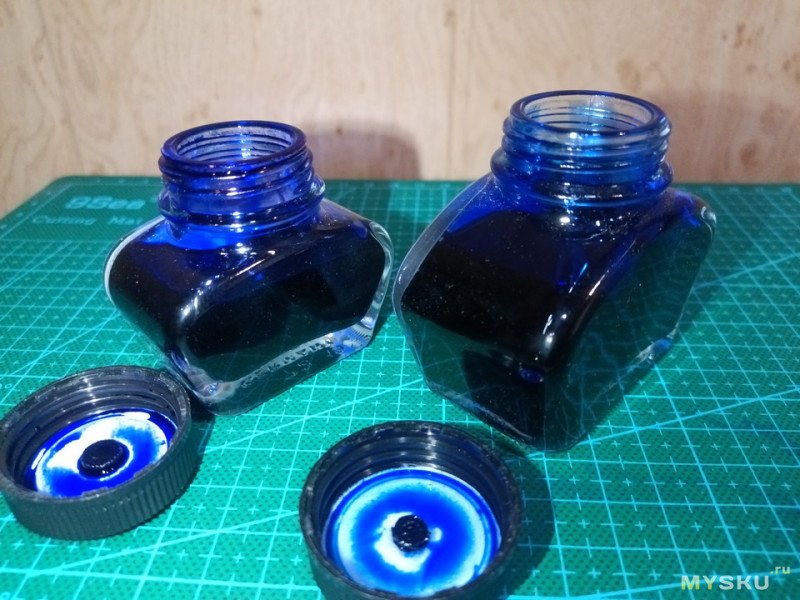 Аккуратно достаем банки из упаковки, не трогая крышки. На просвет чернила в них выглядят по-разному. В большой банке синий оттенок более насыщенный. Теперь обратим внимание на крышки.