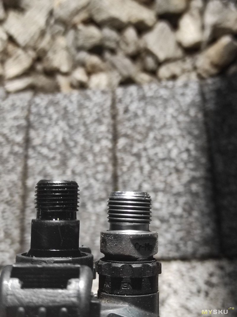 Открутил старые педали, новая и старая педаль. Правая педаль откручивается как обычно, на левой педали левая резьба и откручивать нужно по часовой стрелке, то есть наоборот.Вес шимано 190гр, вес новой 170гр. Но эти педали не для тех велосипедов, в которых гонятся за снижением веса.
