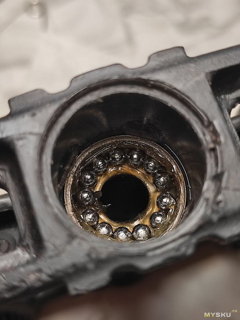 Внутри чашки и по 13 шаров с каждой стороны. Смазки маловато. Это шарики внешнего подшипника, внутренний стоит почти вплотную к резьбе шатуна.