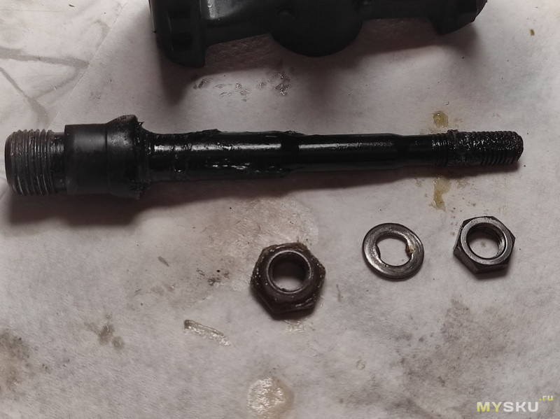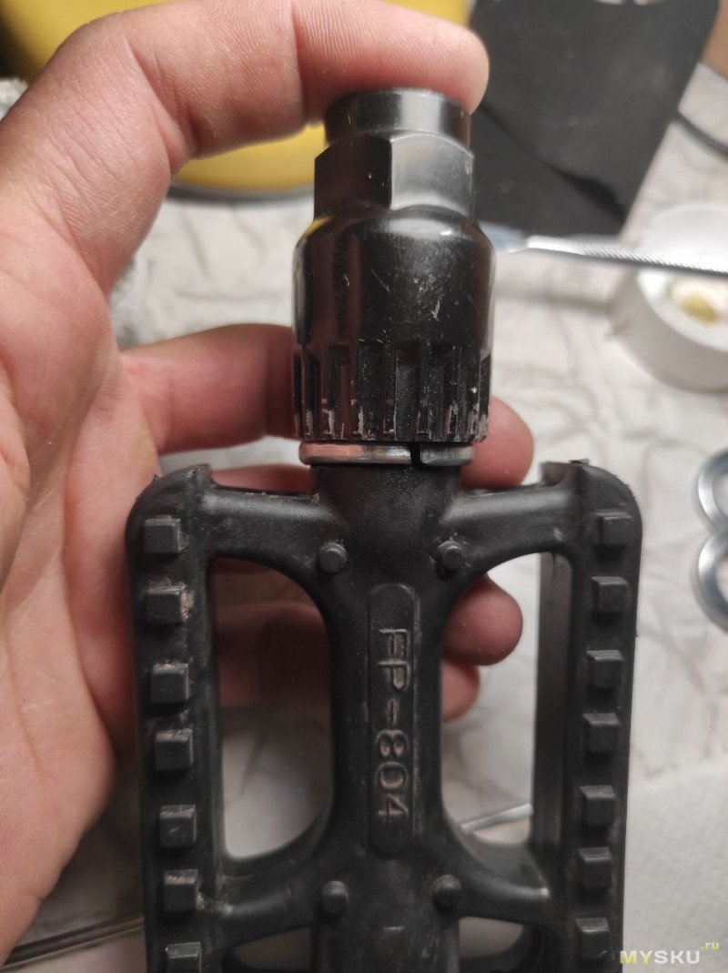 Убрал грязь, песок и лишнюю смазку с педали, вернул резинку на место. Запрессовал шайбу на ось. Для этого подошел съемник каретки.