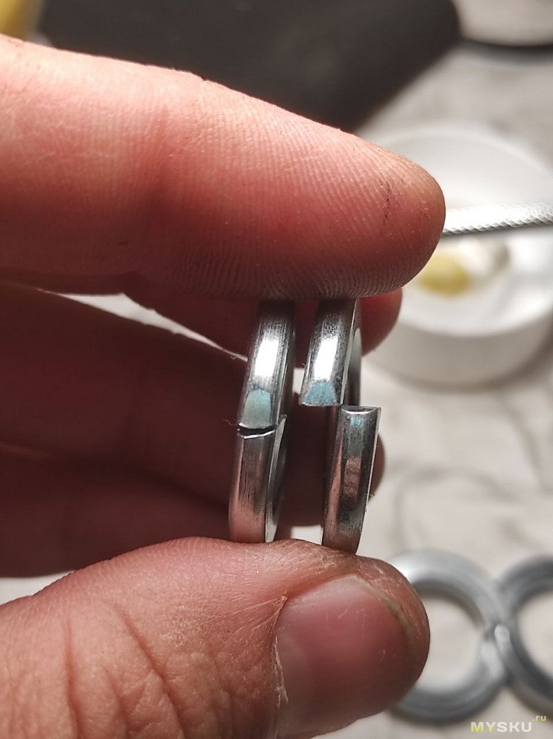 Нужно как-то прижать ее туда. Купил несколько пружинных шайб-гроверов размером М18. Сжал, убрал зазор, выпрямил.