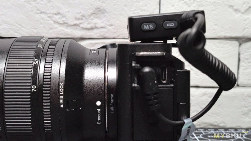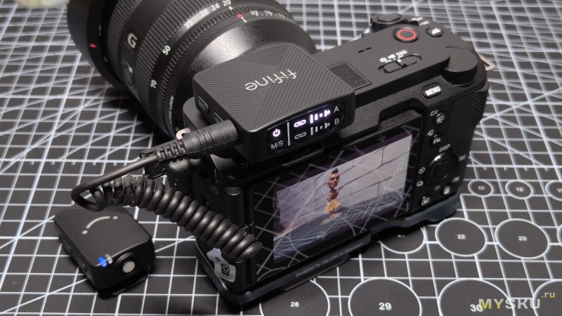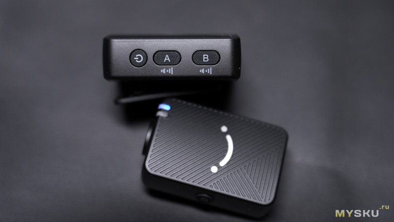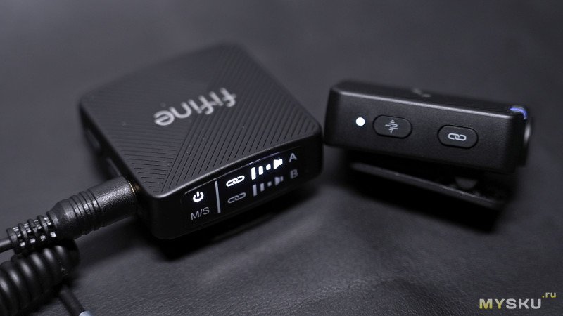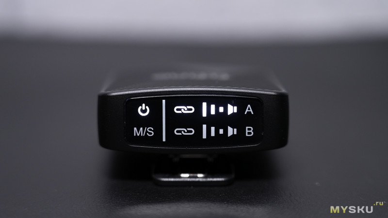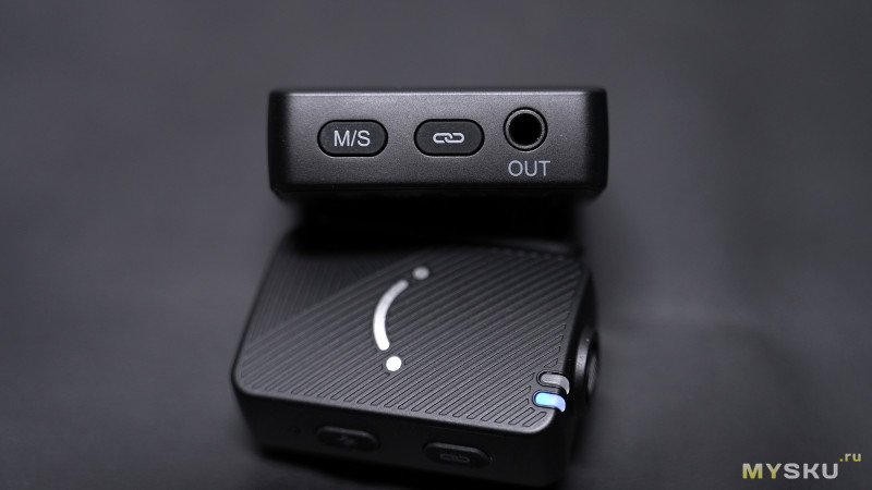 На другой боковине находятся кнопка для переключения режимов стерео/моно и кнопка для спаривания и разъединения соединения с микрофонами. Правее находится круглый 3.5мм Jack для вывода звука на конечное устройство — беззеркальная камера, смартфон или компьютер (через микрофонный вход).