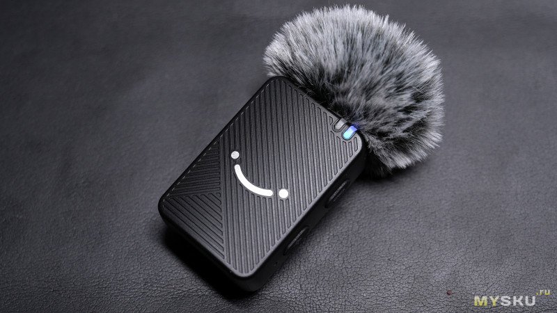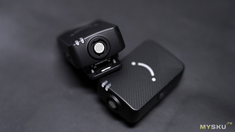 На верхней стороне микрофонов находится металлическая сетка 5мм, прикрывающая микрофонные капсюли и с края корпуса два LED-индикатора, по которым можно сориентироваться о статусе связи или зарядки.