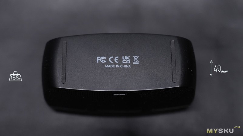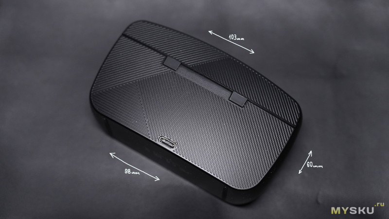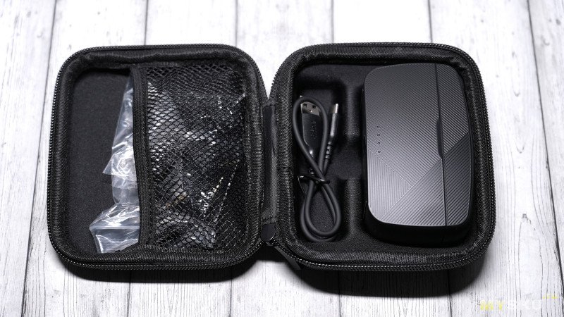Зарядный кейс выполнен в корпусе из чёрного матового пластика, форма крышки слегка обтекаемая выпуклая, остальные стороны имеют чёткие границы. На дне находятся две резиновые ножки против скольжения по столу. На крышке выдавленное лого бренда.