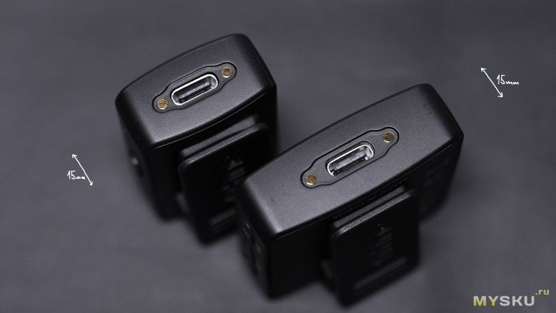 На нижней стороне, как микрофона, так и приёмника находится USB-С разъём для зарядки и пара контактов для зарядки устройств в родном кейсе. В микрофонах установлены аккумуляторы по 150мАч (до 6ч работы), в приёмнике на 280мАч (до 12ч работы), а в кейсе на 1200мАч. Зарядка устройств занимает 1.5ч. Но приёмник через USB-C также можно подключить в порт компьютера или телефона и записывать звук с микрофонов прямо в ОС, но об этом позже.