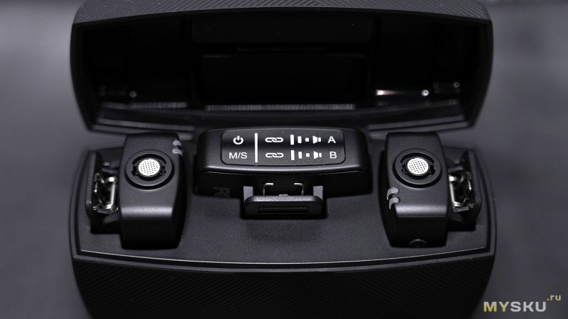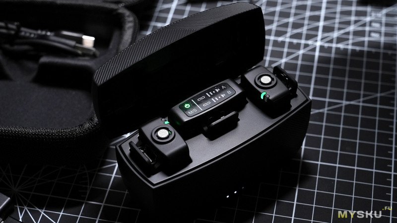 Внутри кейса одновременно находятся два беспроводных микрофона и приёмник посередине. Зарядные контакты изначально заклеены плёнкой, поэтому LED-индикаторы на микрофонах и приёмнике пока не мигают.